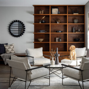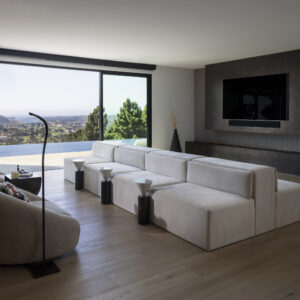 The design embraces a contemporary aesthetic with pops of color that create curated, highly personal spaces. All the spaces are, filled with intricate details and unique character, further elevating the home’s individuality. Highlights include a custom playroom with monkey bars, a climbing wall, and a mezzanine net hammock for lounging and reading, as well as a striking 16-foot wall featuring an intricate wood and marble pattern. The kitchen was entirely reimagined with hidden appliances and a cozy dining nook, while the master suite features a walk-in shower, custom vanities, marble countertops, and microcement walls. The result is a modern sanctuary with clean minimal design, that is both inviting and contemporary.